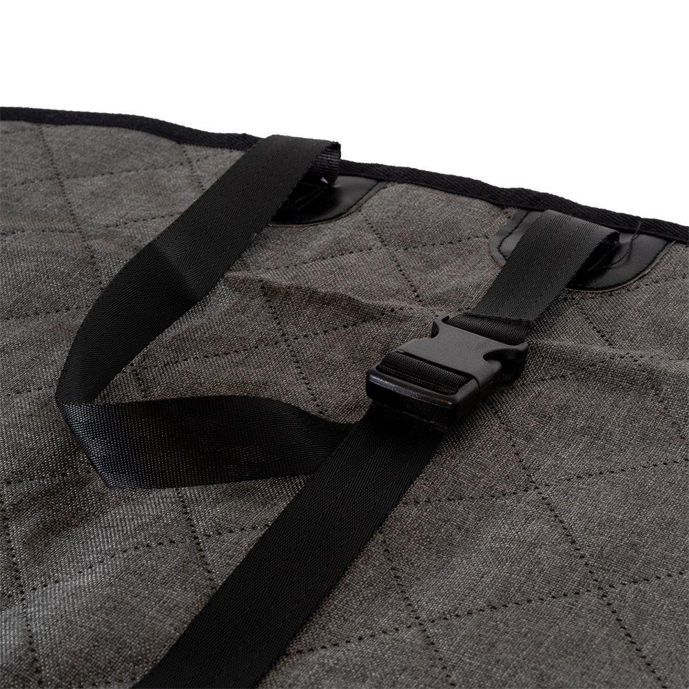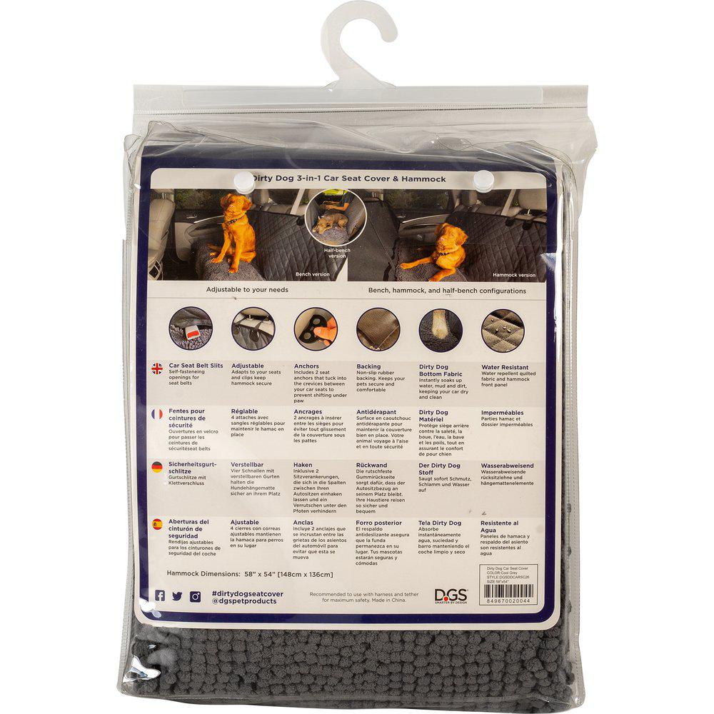 Dirty Dog 3-i-1 bilsetetrekk fungerer både som setetrekk, benk og hengekøye. Den har fire trykkspenner som holder baksetebeskyttelsen sikkert på plass. Den sklisikre gummibunnen, som ikke etterlater merker, forhindrer at underlaget forskyver seg eller klumper seg. I tillegg sikrer to seteankere som stikkes inn i setespaltene at trekket holder seg stabilt under bruk.